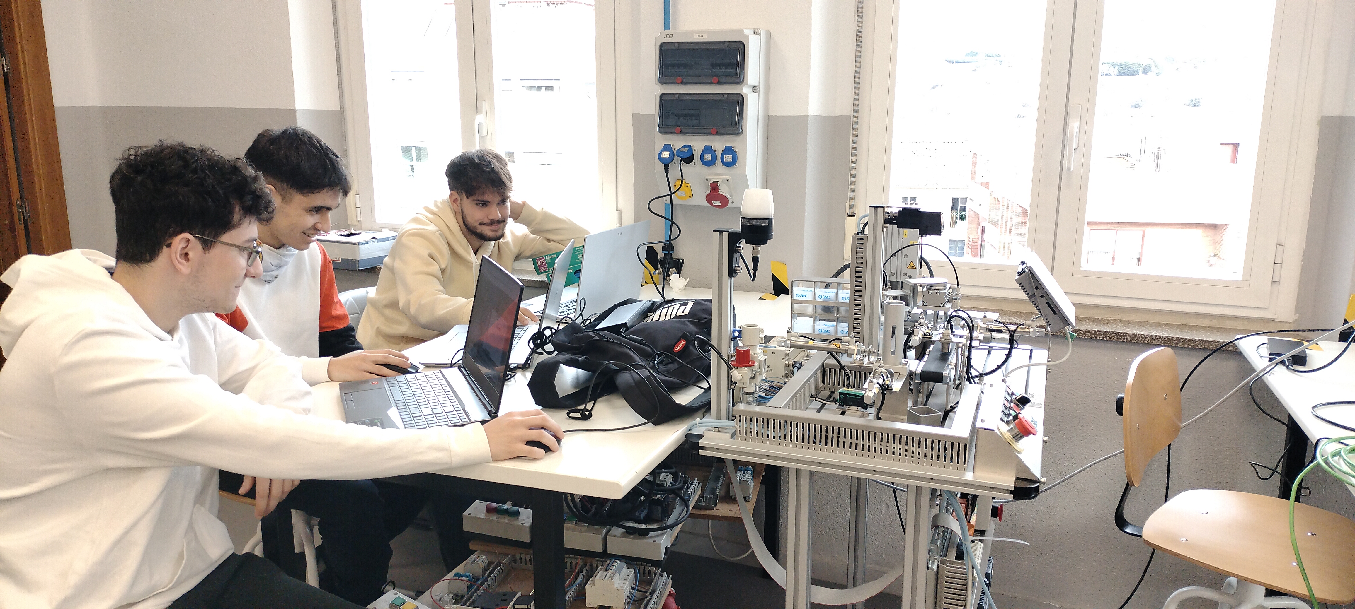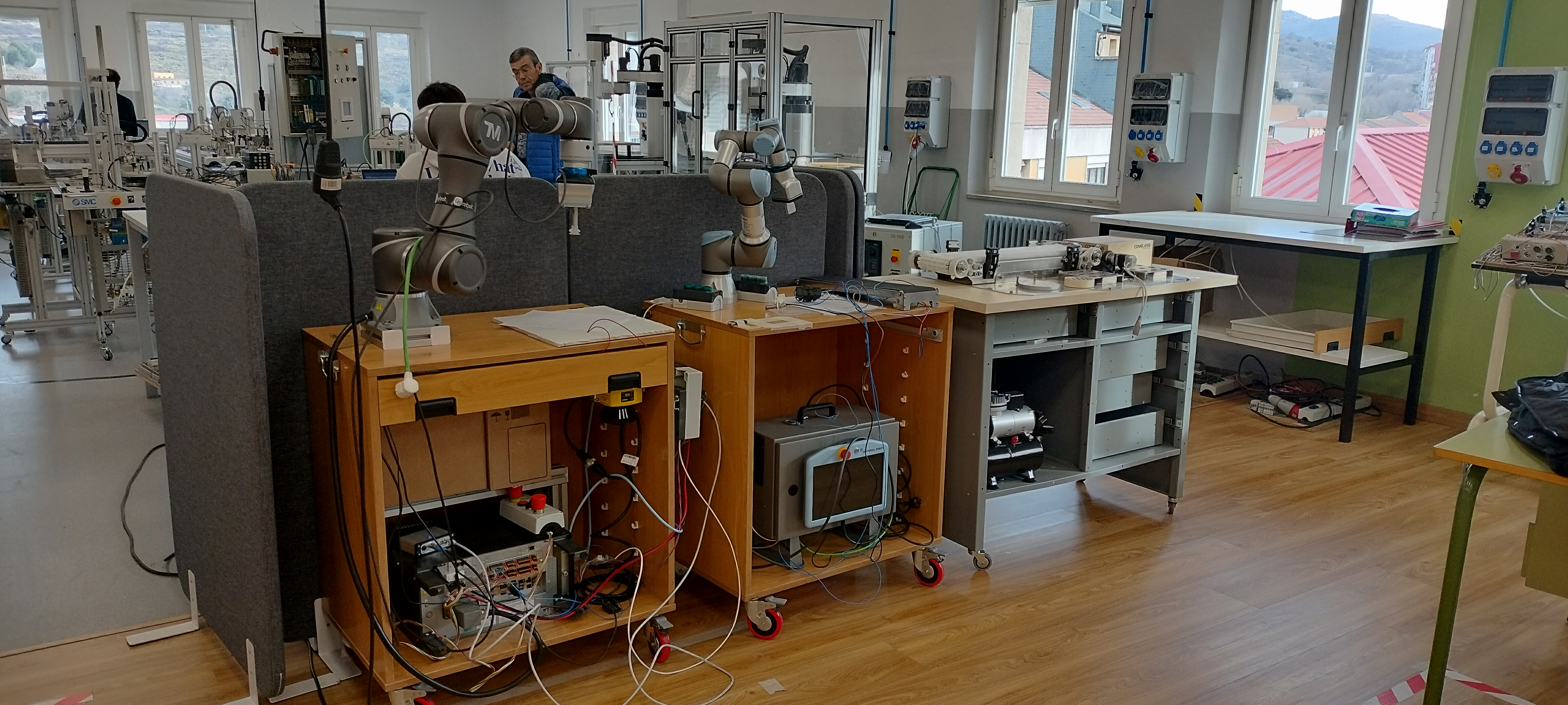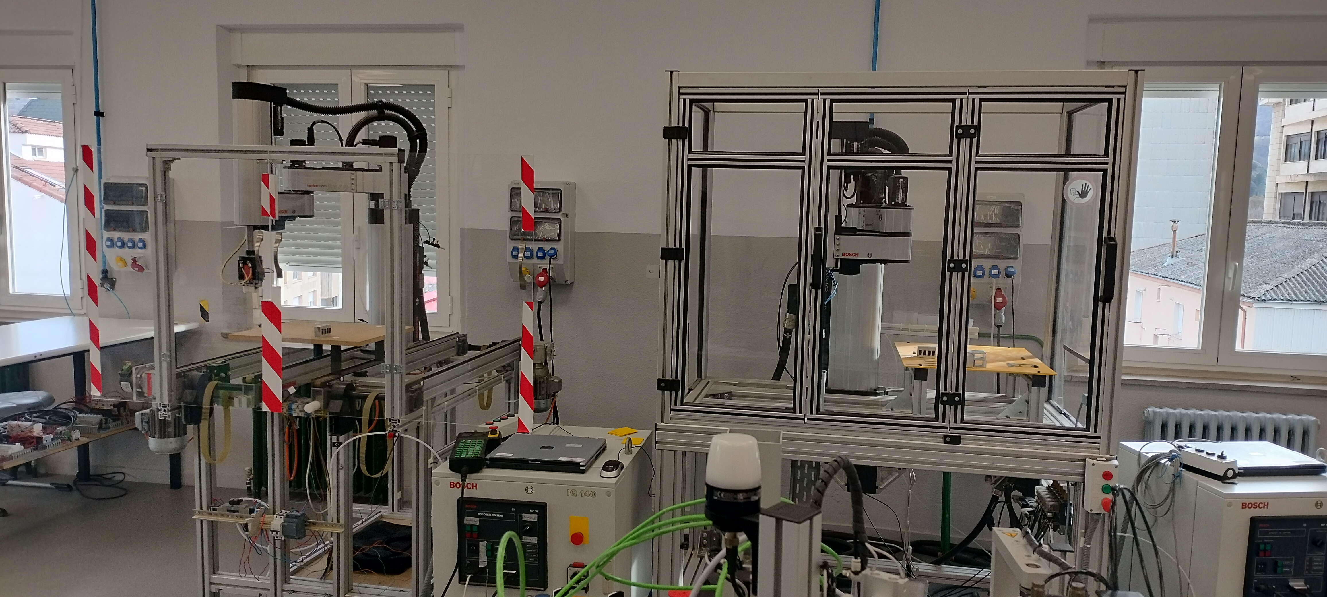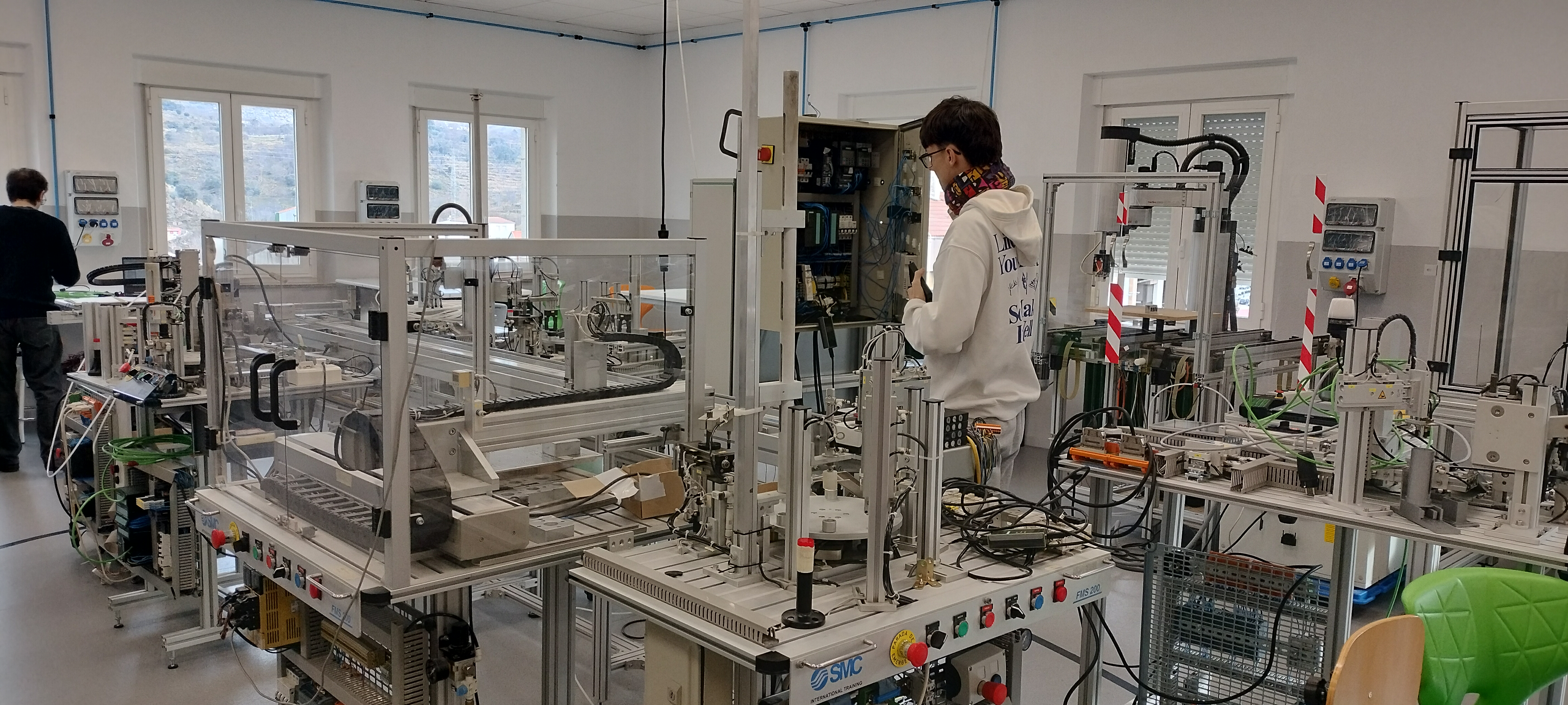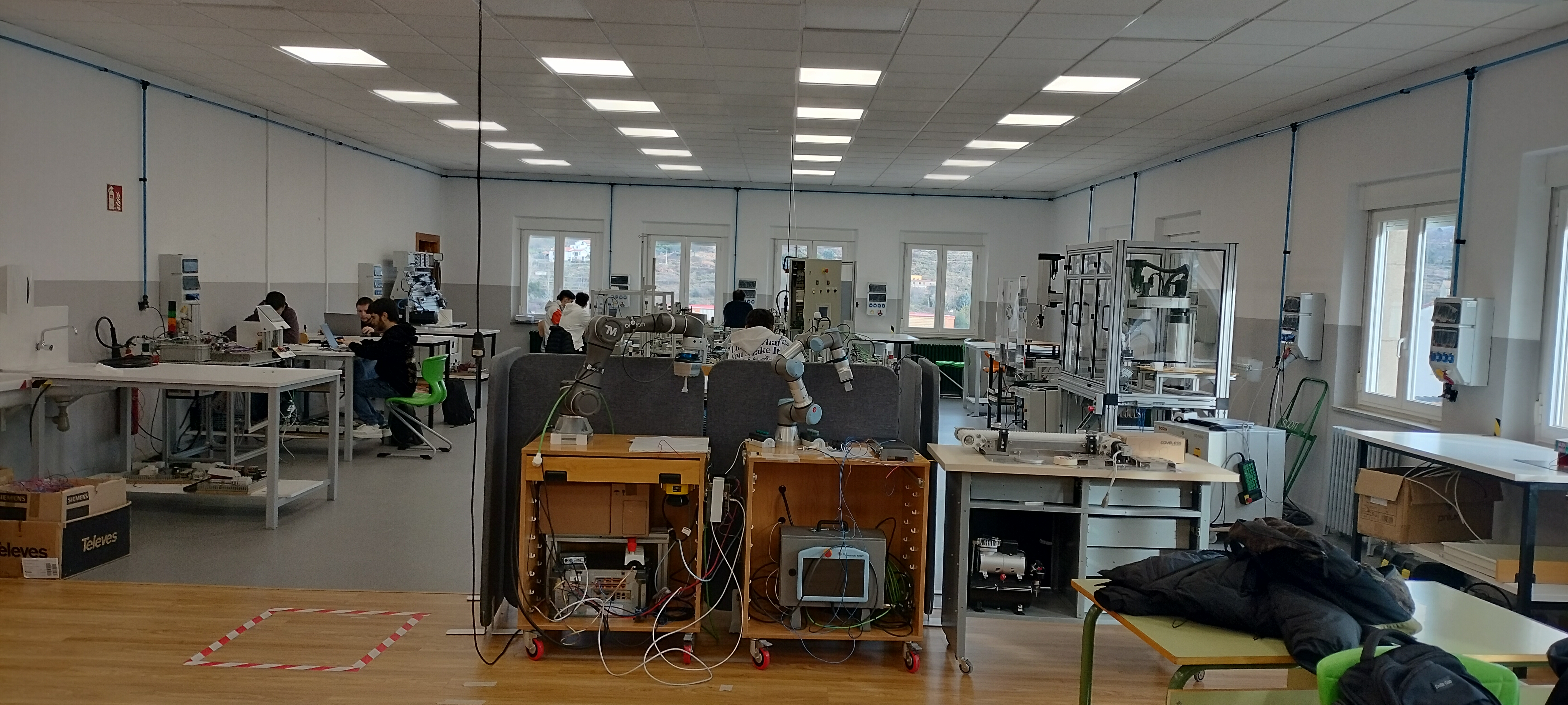 El aula Ateca de la familia de electricidad electrónica cuenta con un equipamiento específico de alta tecnología, en el que destacan los robots industriales, móviles y colaborativos, impresoras 3D, equipos de realidad aumentada y virtual, visión artificial, IoT, células de fabricación flexible…, entre otras tecnologías que hacen que el Aula Ateca deje de ser un espacio de teoría para convertirse en un centro de simulación de la Industria 4.0, con distintos espacios funcionales que imitan el flujo de un proyecto industrial.